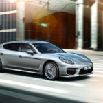 The figures sum it up: 324 kW (440 hp) power output and a maximum torque of 520 Nm. The 4.8-litre naturally aspirated V8 engine with ram induction is extremely responsive. 7-speed Porsche Doppelkupplung (PDK) and the active allwheel drive of Porsche Traction Management (PTM) transmit the engine power of the Panamera GTS adeptly to the tarmac. The sports exhaust system and the adaptive air suspension with ‘normal level’ lowered by 10 mm are fitted as standard. The brake system, wheels, front end and four-way rear spoiler have been carried over from the Panamera Turbo. [...]